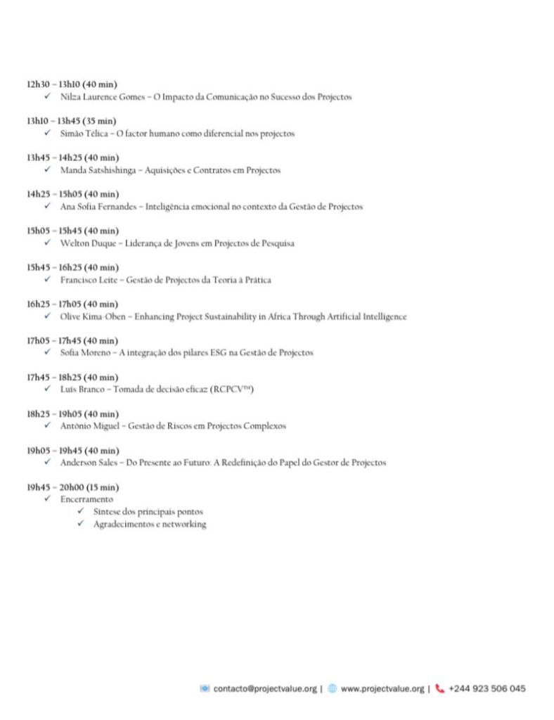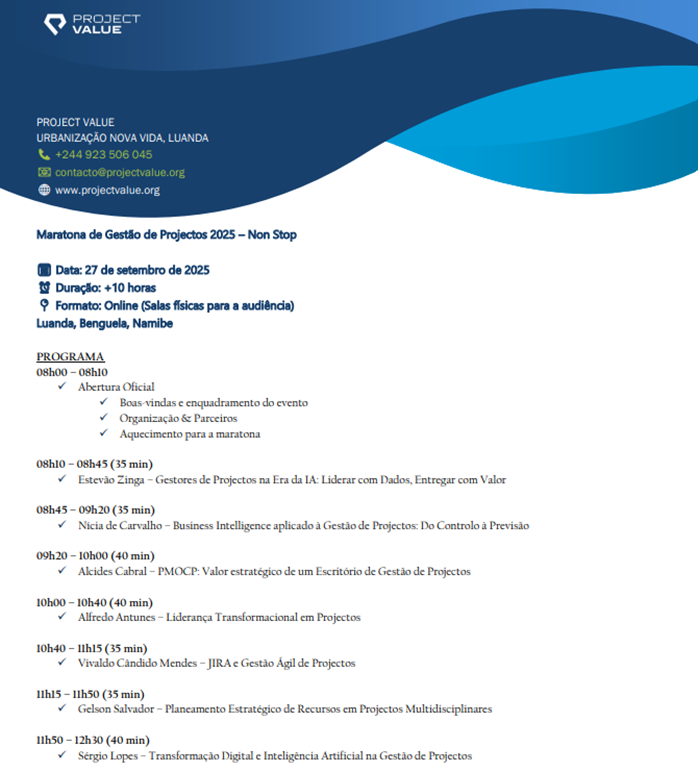 De acordo com a organização, Segundo o documento que o PORTAL PMO ANGOLA, teve acesso, a Maratona de Gestão de Projectos 2025 pretende ainda estimular a criação de uma comunidade sólida de gestores de projectos em Angola, promovendo a certificação profissional, o alinhamento com padrões internacionais e o fortalecimento dos Project Management Offices (PMO) nas instituições públicas e privadas.